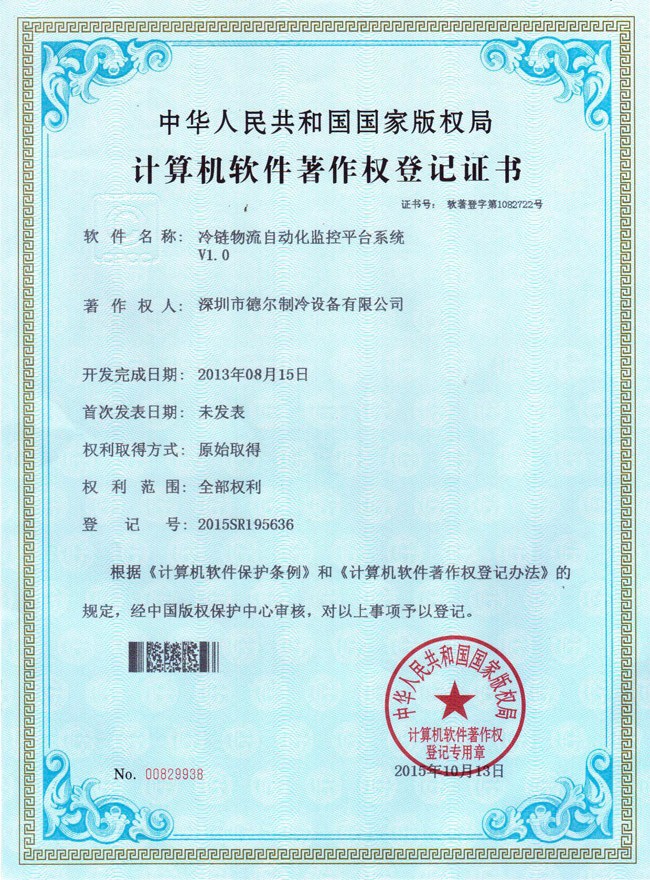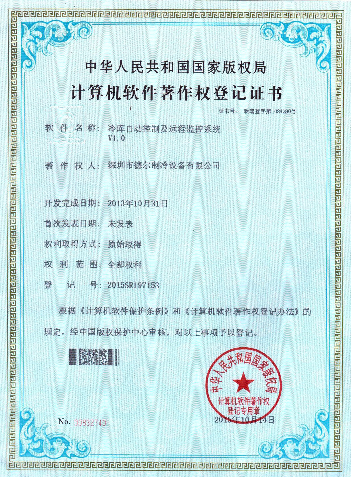 冷庫自動(dòng)控制及遠(yuǎn)程監(jiān)控系統(tǒng) 軟件著作權(quán)證書