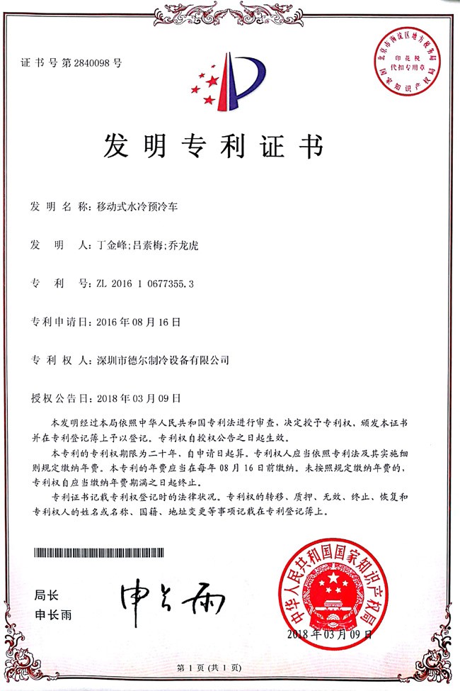 移動(dòng)式水冷預(yù)冷冷車 發(fā)明證書