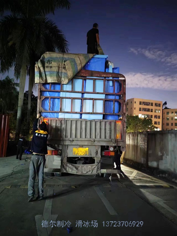 冰場設(shè)備及材料裝車發(fā)運(yùn)照片。圖為設(shè)備與材料從深圳德爾制冷公司裝車,即將發(fā)運(yùn)到南京溧水區(qū)無想水鎮(zhèn)富城薈廣場。